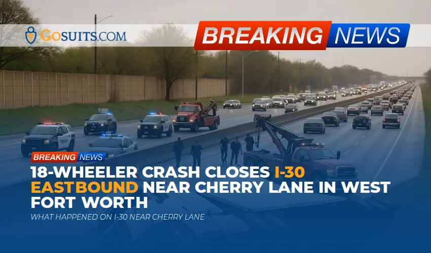 On a Tuesday morning around 8 a.m., emergency crews responded to a major collision on Interstate 30 eastbound near Cherry Lane in West Fort Worth. Early television helicopter images showed an 18-wheeler positioned off to the side of the freeway with multiple police units and wreckers at the scene. All eastbound lanes were closed while investigators worked, which quickly created a long backup for commuters heading toward downtown Fort Worth and Arlington.