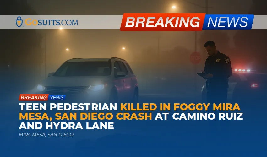 A boy, estimated to be about 15 years old, was struck and killed by a white 2020 Chevrolet Traverse SUV in Mira Mesa on Saturday night. According to the San Diego Police Department, the collision occurred around 11:10 p.m. at the intersection of Camino Ruiz and Hydra Lane. The vehicle was traveling northbound on Camino Ruiz. Officers noted that the area was foggy at the time, and it was unknown what direction the pedestrian was traveling when the impact occurred. The 40-year-old driver was not injured. Officers stated that driving under the influence is not suspected. The teen was pronounced deceased at the scene.