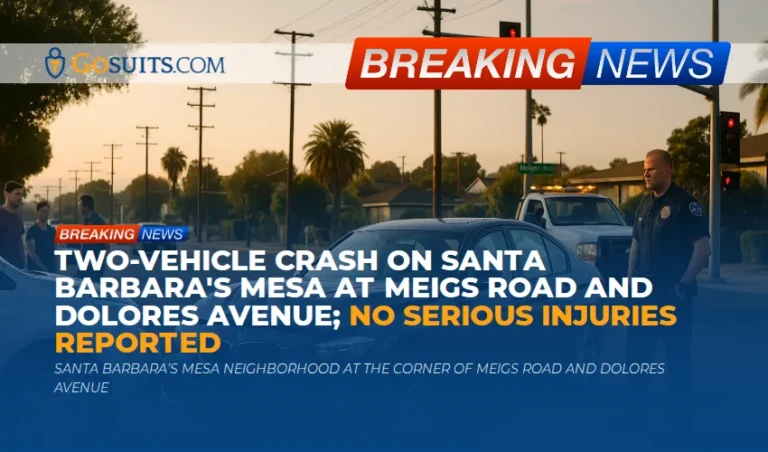 On Thursday evening, March 18, 2026, just before 6:00 p.m., a two vehicle collision occurred in Santa Barbara’s Mesa neighborhood at the corner of Meigs Road and Dolores Avenue, a short walk from the Mesa McDonald’s and Taco Bell. According to a reader report, one vehicle was a BMW 3 series reportedly driven by a teenager. The second vehicle was described as a minivan or SUV carrying a family of four. The BMW’s front end appeared heavily damaged, and all occupants from both vehicles were seen outside, waiting along the side of the street. The on scene observation suggested there were no apparent serious injuries. A Santa Barbara Police Department officer and a tow truck responded. No further official information had been provided at the time of the reader’s report.